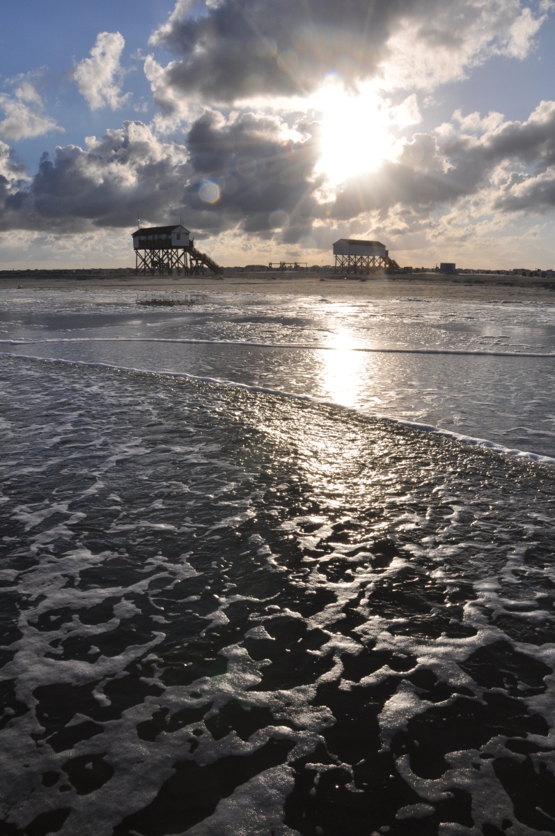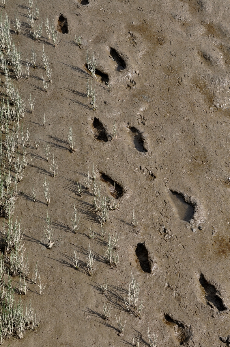 Aufgenommen in St. Peter-Ording von einer Brücke sieht man hier die Spuren von Zutrittsberechtigten (kleine Abdrücke) und widerrechtlichen Läufern (große Abdrücke).